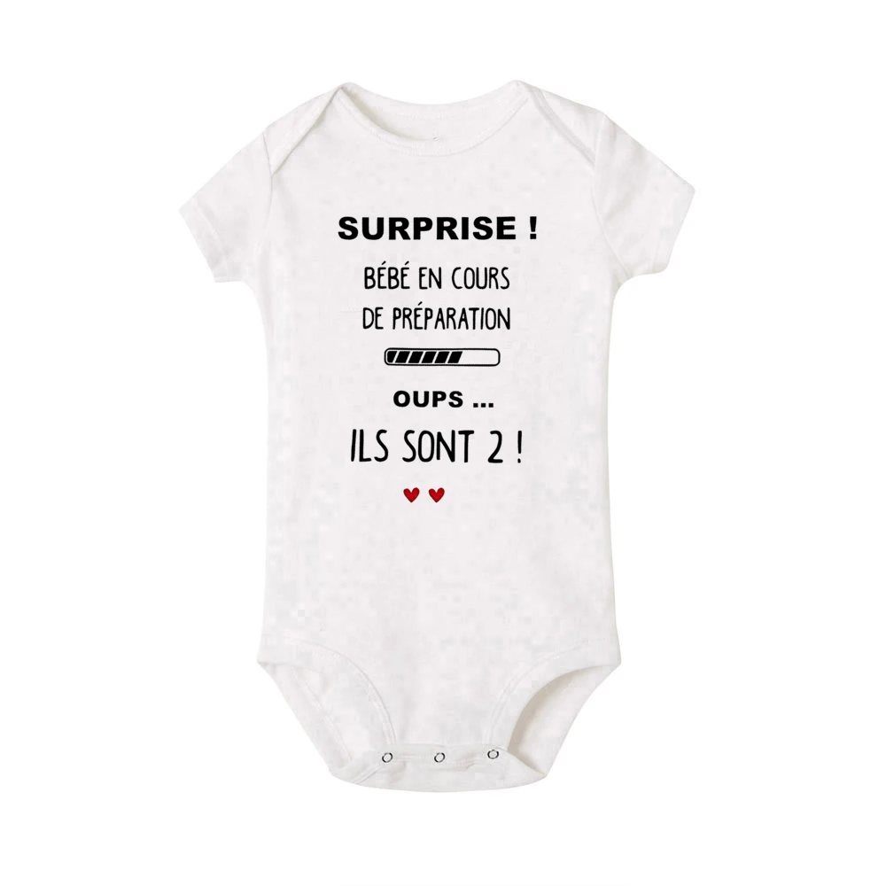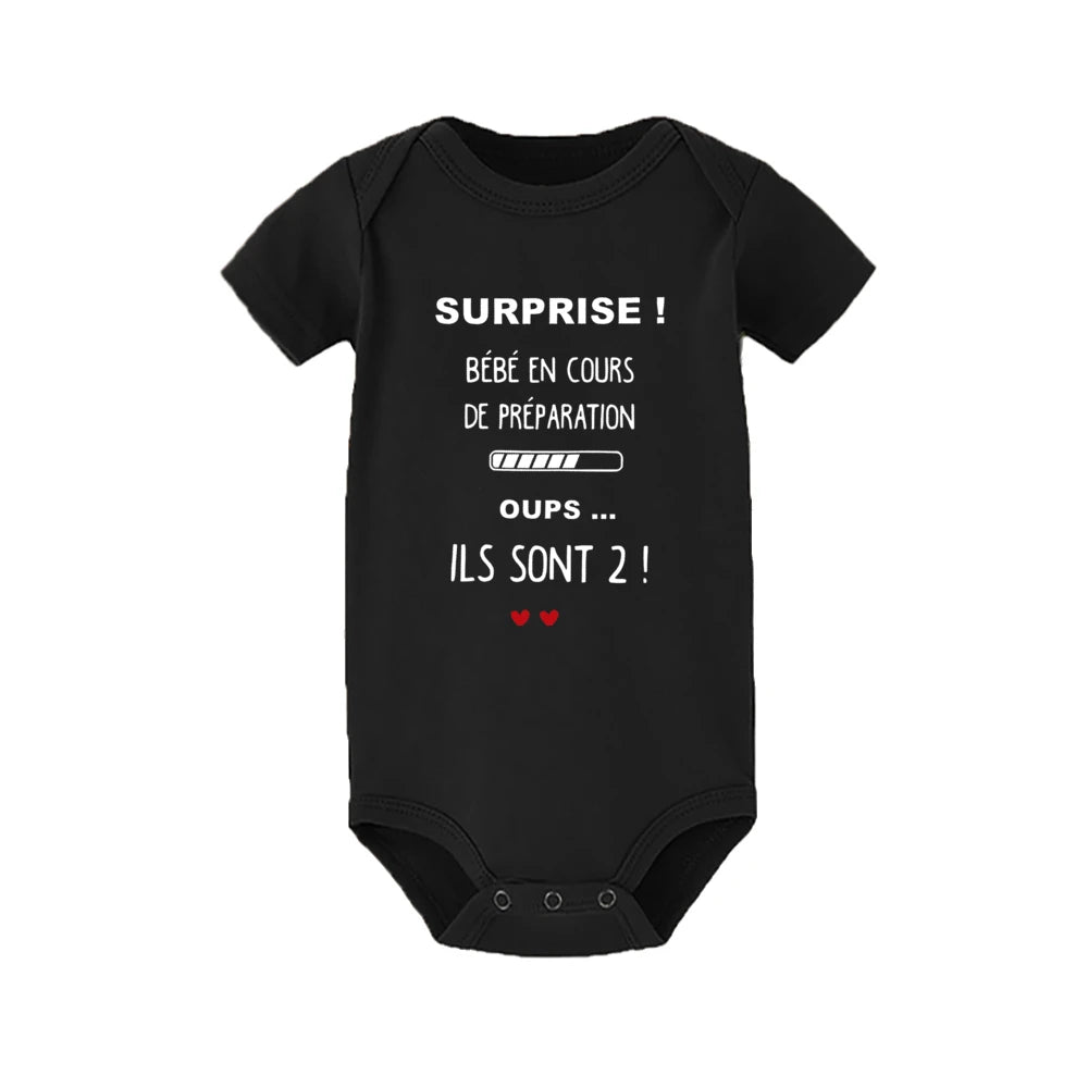 Annoncez la plus belle des surprises avec notre body “Surprise ! Bébé en cours de préparation... Oups, ils sont 2 !”.