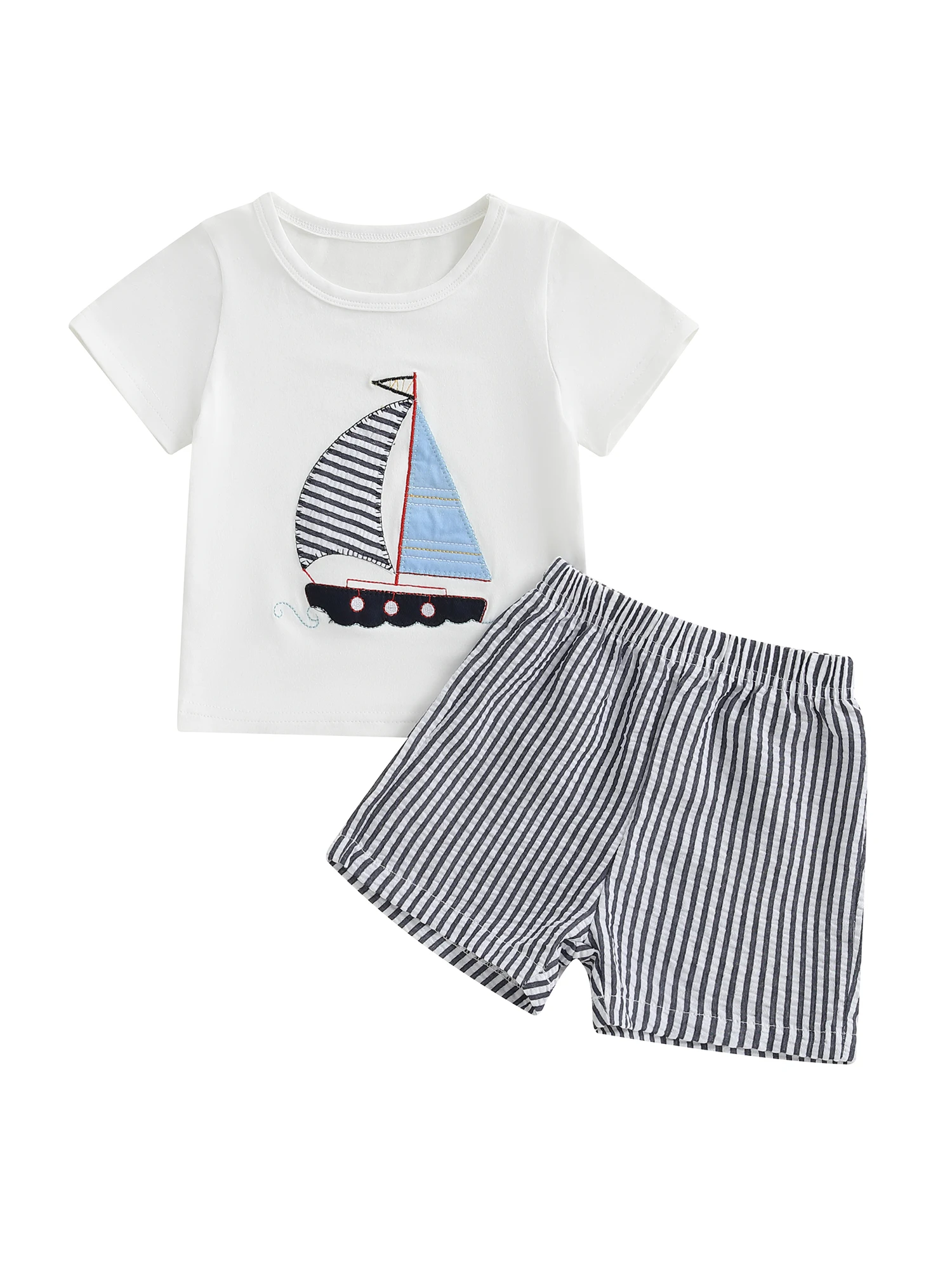 Ensemble d’Été Bébé Garçon – T-Shirt Voilier Brodé & Short Rayé