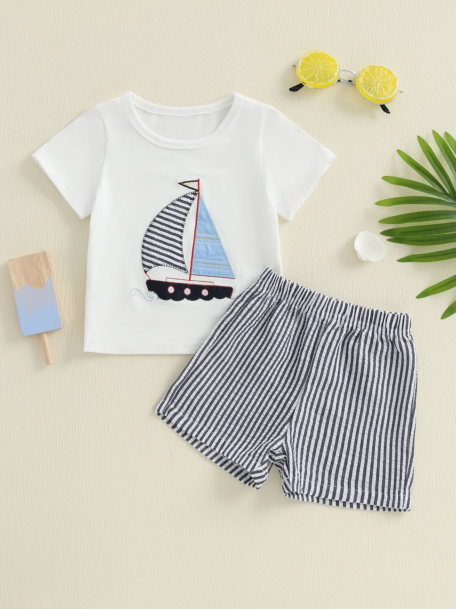 Ensemble d’Été Bébé Garçon – T-shirt Voilier Brodé + Short Rayé | Tenue Plage Confort & Style