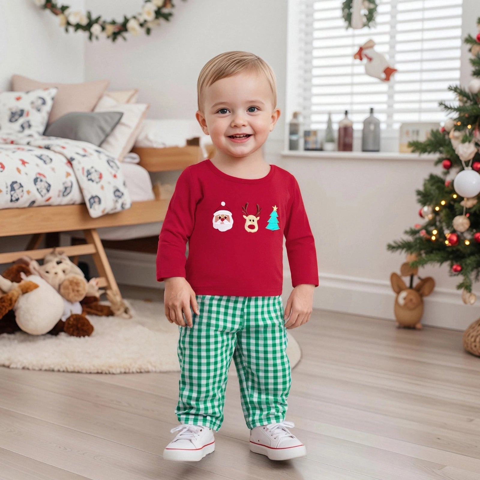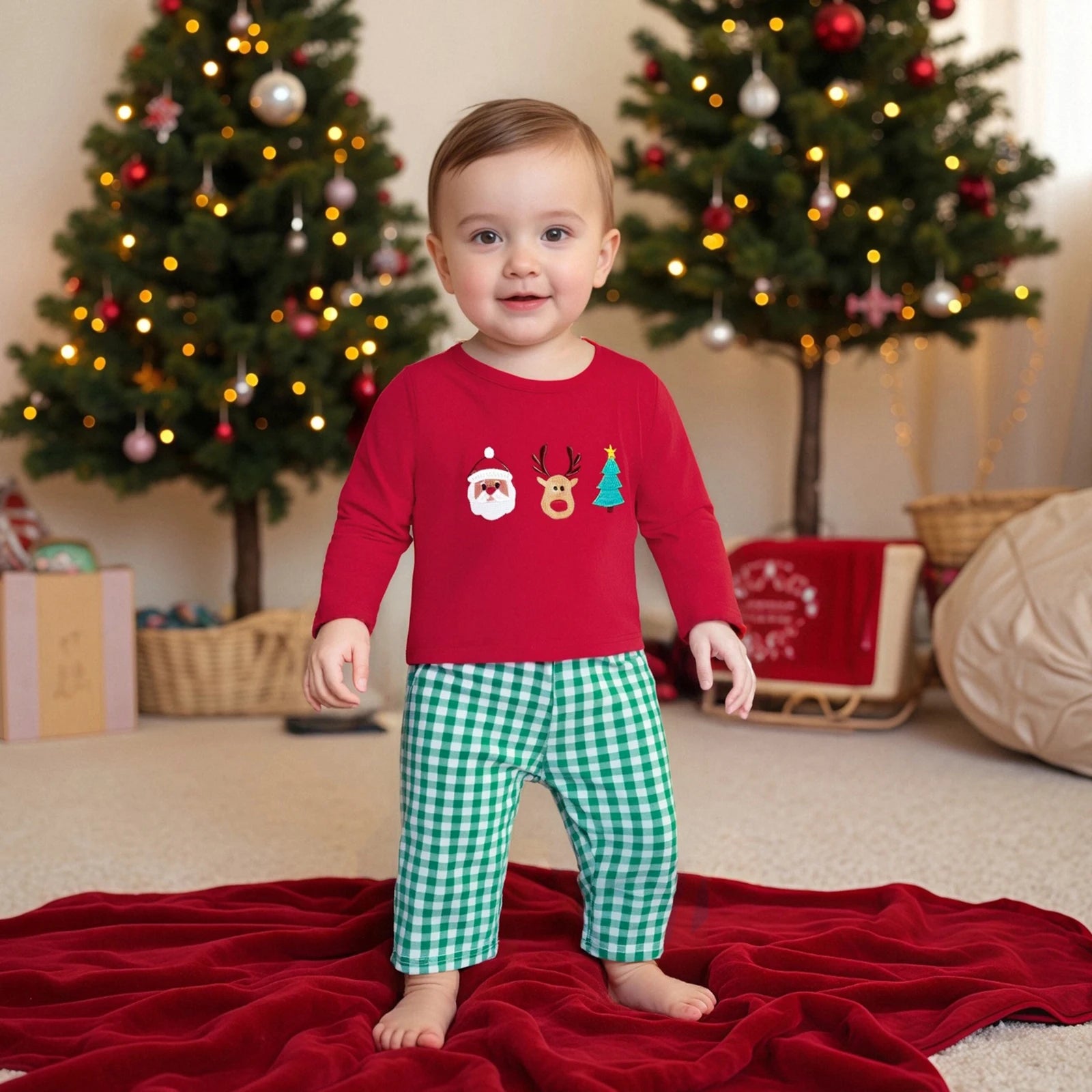 Vous souvenez-vous de votre premiÚre photo de Noël? Ces images deviennent des trésors familiaux qui traversent les années. La combinaison du rouge vibrant et des motifs festifs de notre ensemble crée instantanément une ambiance magique sur les photos. Les broderies détaillées du PÚre Noël, du renne et du sapin ajoutent cette touche d'émerveillement qui fait briller les yeux des petits comme des grands.