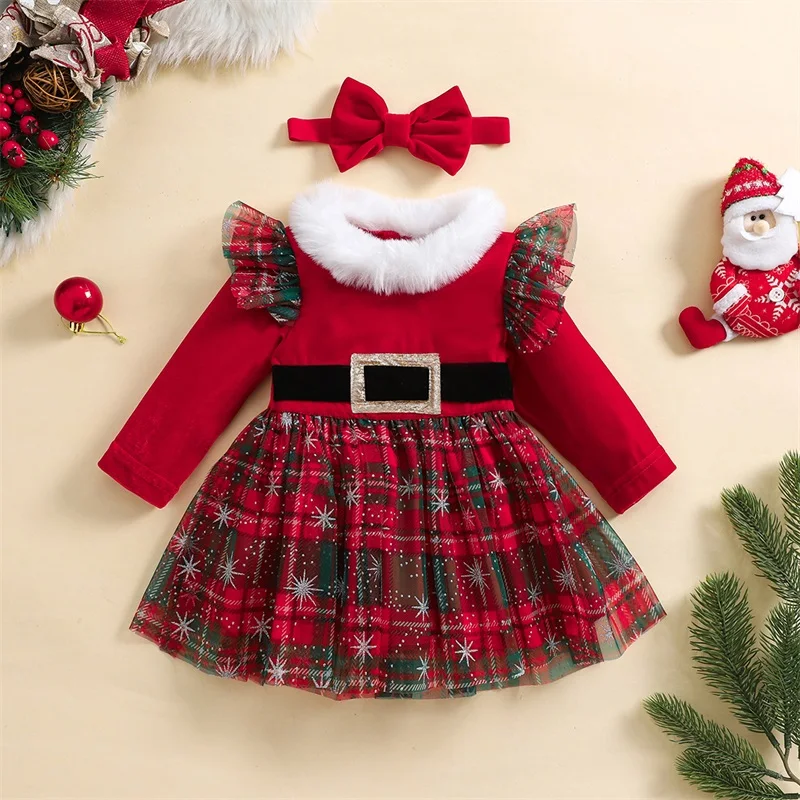 Robe de Noël bébé fille avec col fourrure et jupe tutu à carreaux + bandeau