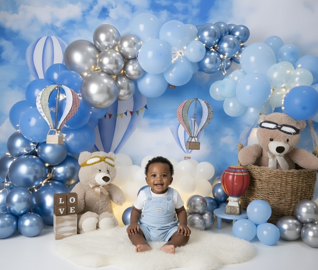 Imaginez les yeux brillants de votre petit ange devant cette arche de ballons scintillants bleus et argentés, symbolisant la pureté et la joie. De charmants ballons montgolfières semblent flotter dans un ciel onirique, tandis que de tendres oursons veillent sur ce moment si spécial.